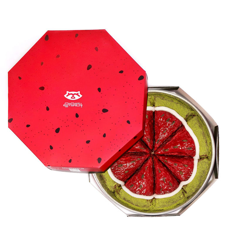 وقتی درِ جعبه رو باز میکنی، اولین چیزی که چشم رو میگیره، رنگ قرمز مخملیِ سطح باقلواست که بهطرز حرفهای شبیه هندونه طراحی شده. دونههای سیاه، چینش برشها، سبزی پودر پسته اطرافش… همهچیز با دقت کنار هم چیده شده تا یه اثر هنری خوراکی جلوت باشه.